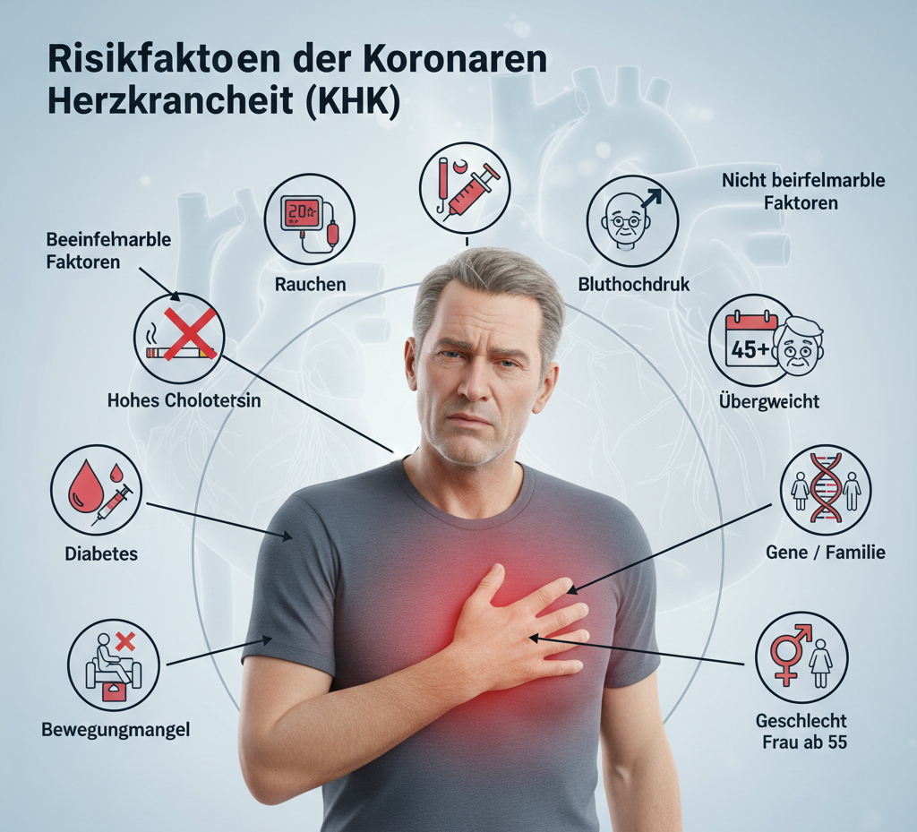 • Das Alter: Je älter ein Mensch wird, desto länger hatten die Adern Zeit, zu verkalken. Deshalb haben ältere Menschen öfter KHK.