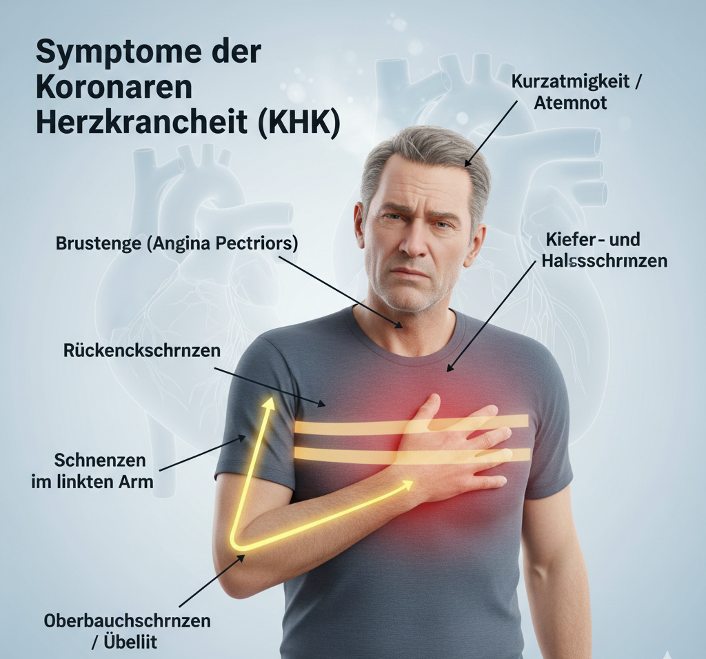 • Brust-Enge: Man fühlt einen starken Druck oder Schmerz in der Brust. Es fühlt sich an, als würde jemand die Brust zusammendrücken.